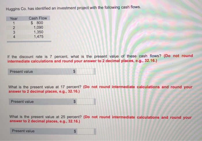 Answer to Present Value and Multiple Cash Flows Sea born Co. Students also viewed these Cost Accounting questions Huggins Co. If the discount rate is 10 percent what is the present value of these cash flows.